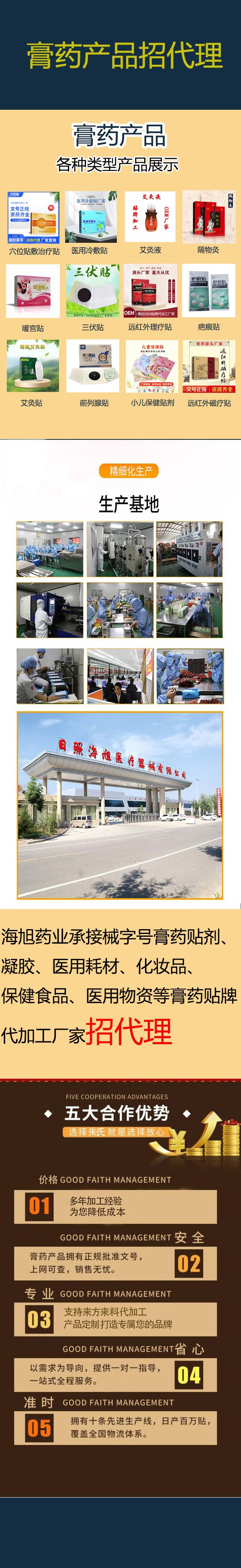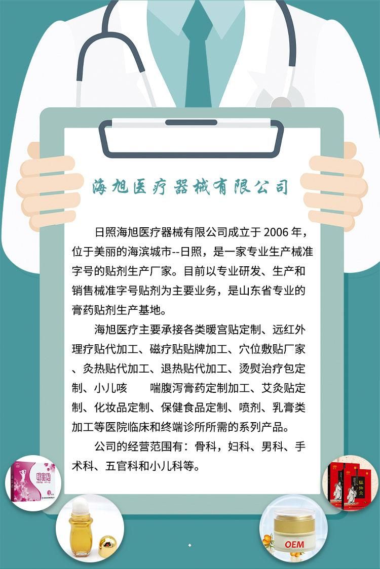 - 海旭醫(yī)療主要承接各類暖宮貼定制、遠紅外理療貼代加工、磁療貼貼牌加工、穴位敷貼廠家、灸熱貼代加工、退熱貼代加工、燙熨治療包定制、小兒咳 喘腹瀉膏藥定制加工、艾灸貼定制、化妝品定制、保健食品定制、噴劑、乳膏類加 工等醫(yī)院臨床和終端診所所需的系列產(chǎn)品。公司的經(jīng)營范圍有:骨科,婦科、男科、手術(shù)科、五官科和小兒科等。