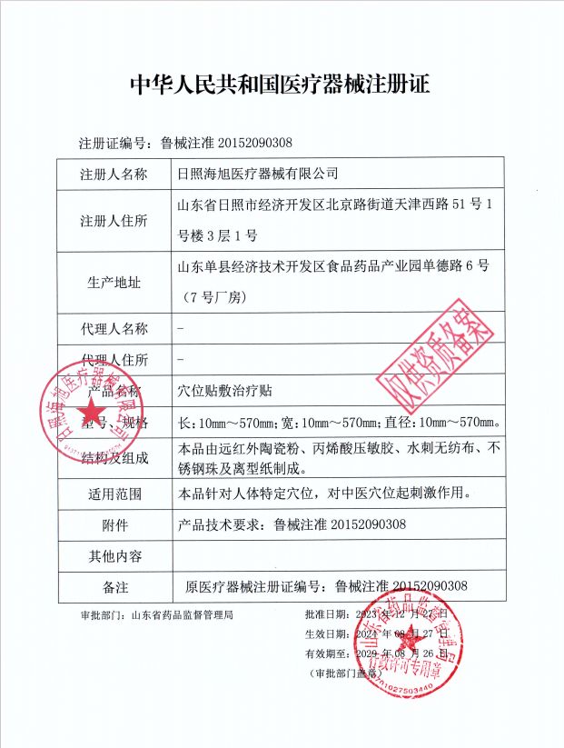 | 補(bǔ)充說(shuō)明 | 【結(jié)構(gòu)性能】本品由遠(yuǎn)紅外陶瓷粉、丙烯酸壓敏膠、水刺無(wú)紡布、不銹鋼珠及離型紙制成。穴位貼敷治療貼的壓敏膠布剝離強(qiáng)度不小于1.0N/cm,持粘性應(yīng)不大于2.5mm,遠(yuǎn)紅外發(fā)射波長(zhǎng)范圍8μm-15μm,法向比輻射率≥75%。 【適用范圍】本品針對(duì)人體特定穴位,對(duì)中醫(yī)穴位起刺激作用。 【注意事項(xiàng)】1、**一次性使用,用后銷毀; 2、叮囑患者定時(shí)按壓,按壓不能過(guò)度用力,以不損傷皮膚為宜; 3、無(wú)粘性、包裝破損或過(guò)有效期禁止使用; 4、夏季多汗,宜勤換; 5、敷貼后如有過(guò)敏等不適,應(yīng)停止敷貼。 【慎用】糖尿病、高熱患者。 【禁忌癥】孕婦、皮膚潰爛處禁用。 【有效期】?jī)赡辏ㄓ杉铀僭囼?yàn)獲得)。 【儲(chǔ)存條件】本產(chǎn)品應(yīng)貯存在相對(duì)濕度不超過(guò)80%,無(wú)腐蝕性氣體、陰涼、干燥、通風(fēng)良好、清潔的環(huán)境內(nèi)。 |