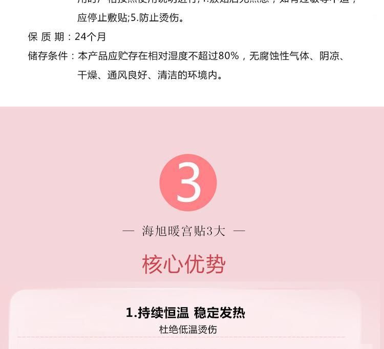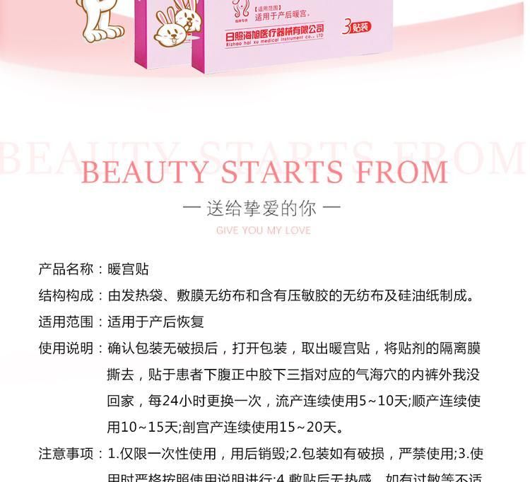 | 使用方法 | 【使用說明】確認(rèn)包裝無破損后,打開包裝,取出暖宮貼,將貼劑的隔離膜撕去,貼于患者下腹正中臍下三指對應(yīng)的“氣海穴”的內(nèi)褲外側(cè),每24小時更換一次,流產(chǎn)連續(xù)使用5~10天;順產(chǎn)連續(xù)使用10~15天;剖宮產(chǎn)連續(xù)使用15~20天。 |