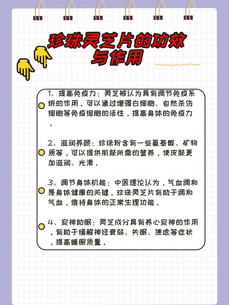 | 補(bǔ)充說(shuō)明 | 珍珠靈芝片方中靈芝對(duì)于增強(qiáng)人體免疫力,調(diào)節(jié)血糖,控制血壓,輔助腫瘤放化療,保肝護(hù)肝,促進(jìn)睡眠等方面均具有**療效。服藥期間*好要忌食辛辣,刺激油膩的食物,同時(shí)也不能喝茶,咖啡,因?yàn)檫@些食物或者飲品會(huì)影響藥物的吸收,從而影響藥效。 臨床試驗(yàn)證明,珍珠靈芝片治療冠心病效果**。珍珠靈芝片對(duì)慢性、遷延性肝炎有護(hù)肝、解毒、降谷一丙轉(zhuǎn)氨酶作用;對(duì)四氯化碳引起的肝損害有良好的保護(hù)作用。 方中的靈芝浸膏是來(lái)源于靈芝,靈芝能用于心神不寧,失眠,驚悸。該品味甘性平,入心經(jīng),能補(bǔ)心血、益心氣、安心神,故可用治氣血不足、心神失養(yǎng)所致的心神不寧、失眠、驚悸、多夢(mèng)、健忘、體倦神疲、食少等癥。 珍珠靈芝片功能主治養(yǎng)心安神,滋補(bǔ)肝腎,用于慢性肝炎,神經(jīng)衰弱,頭暈失眠,胃腸潰瘍,慢性支氣管炎,冠心病等癥。對(duì)人體的作用還包括能明顯抑制潰瘍,抑制胃酸分泌和祛痰平喘作用;珍珠層粉、郁金二酮等有明顯延長(zhǎng)家貓睡眠,具有鎮(zhèn)靜安眠作用;能抗心肌缺氧及減輕冠狀動(dòng)脈粥樣硬化等作用。 |