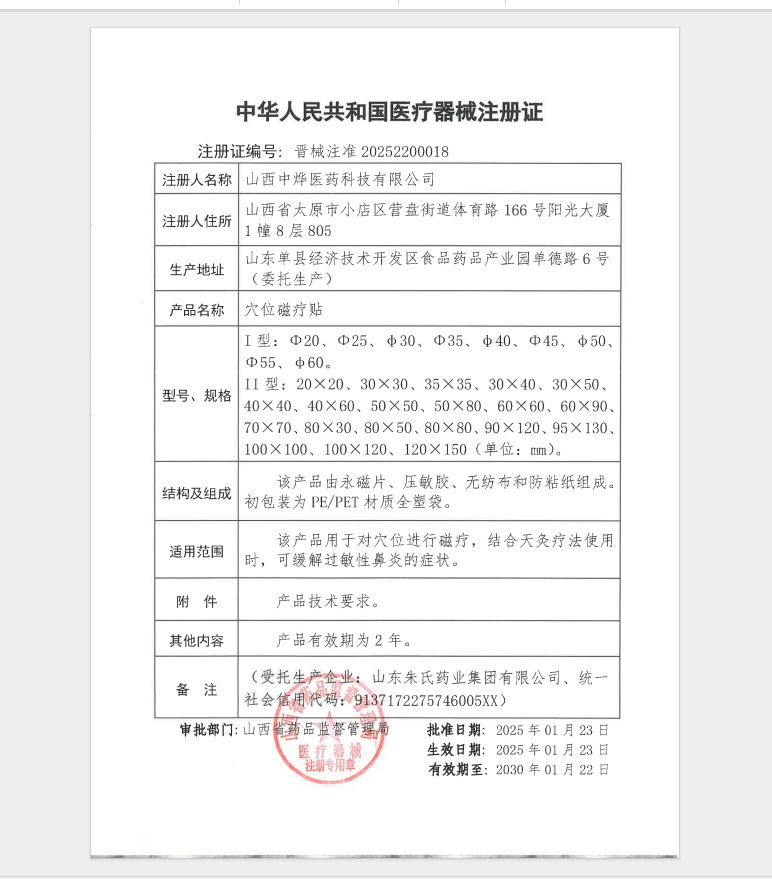 | 產(chǎn)品用途 | 該產(chǎn)品用于對(duì)穴位進(jìn)行磁療,結(jié)合天灸療法使用時(shí),可緩解過敏性鼻炎的癥狀。 |