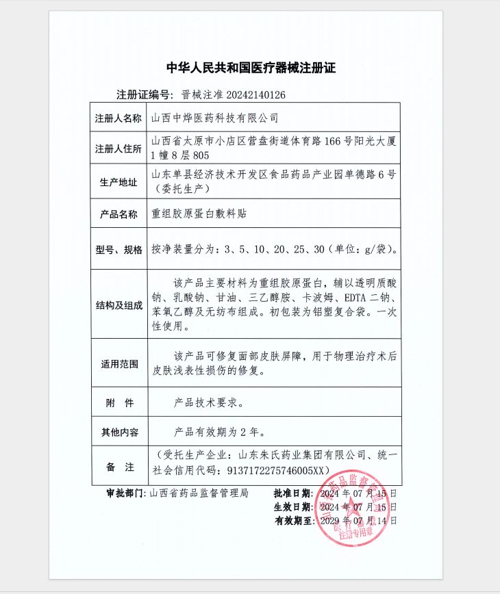 | 產(chǎn)品名稱 | 重組膠原蛋白敷料貼 |