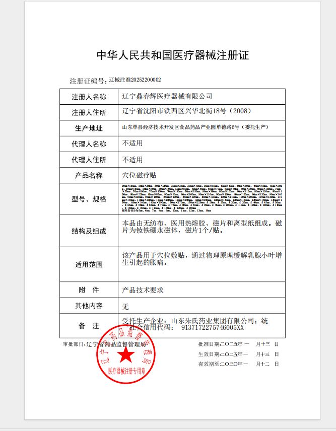 | 產品用途 | 該產品用于穴位敷貼,通過物理原理緩解乳腺小葉增生引起的脹痛。 |
