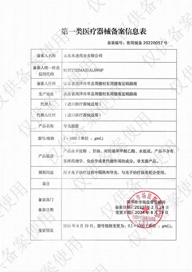 | 補(bǔ)充說明 | 【產(chǎn)品名稱】導(dǎo)光凝膠 【型號(hào)規(guī)格】50g 【產(chǎn)品描述】產(chǎn)品由卡波姆、甘油、對(duì)羥基苯甲酸乙酯、水組成。產(chǎn)品不含有發(fā)揮藥理學(xué)、免疫學(xué)或者代謝作用的成分。非無菌產(chǎn)品。 【預(yù)期用途】用于光子治療過程中隔熱和導(dǎo)光,與光子治療設(shè)備配合使用。 【使用方法】外用,直接涂抹于患處。 【注意事項(xiàng)】 1、本品不屬于藥品; 2、本品外用禁口服; 3、過敏體質(zhì)者慎用; 4、皮膚有開放性傷口、化膿或有明顯滲出者禁用; 5、請(qǐng)將本品放在兒童不能接觸的地方; 6、本品性狀發(fā)生改變時(shí)禁止使用; 7、使用本品后有不適癥狀者應(yīng)停止使用或向醫(yī)生咨詢。 【禁忌癥】對(duì)本品成分過敏者禁用。 【儲(chǔ)存條件】密封、常溫下貯存和運(yùn)輸,運(yùn)輸過程中輕拿輕放。 【備案憑證編號(hào)】魯菏械備20220057號(hào) 【產(chǎn)品技術(shù)要求編號(hào)】魯菏械備20220057號(hào) 【生產(chǎn)備案憑證編號(hào)】魯菏食藥監(jiān)械生產(chǎn)備20170002號(hào) |