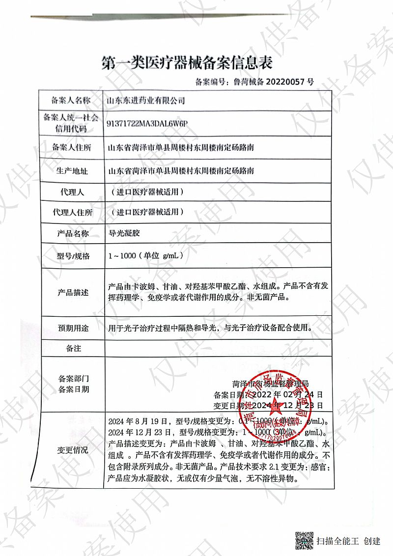 | 補(bǔ)充說(shuō)明 | 【產(chǎn)品名稱(chēng)】導(dǎo)光凝膠 【型號(hào)規(guī)格】35g/瓶×1瓶/盒 【產(chǎn)品描述】產(chǎn)品由卡波姆、甘油、對(duì)羥基苯甲酸乙酯、水組成。產(chǎn)品不含有發(fā)揮藥理學(xué)、免疫學(xué)或者代謝作用的成分。非無(wú)菌產(chǎn)品。 【預(yù)期用途】用于光子治療過(guò)程中隔熱和導(dǎo)光,與光子治療設(shè)備配合使用。 【使用方法】外用,直接涂抹于患處。 【注意事項(xiàng)】 1、本品不屬于藥品; 2、 本品外用禁口服; 3、過(guò)敏體質(zhì)者慎用; 4、 皮膚有開(kāi)放性傷口、化膿或有明顯滲出者禁用; 5、 請(qǐng)將本品放在兒童不能接觸的地方; 6、 本品性狀發(fā)生改變時(shí)禁止使用; 7、 使用本品后有不適癥狀者應(yīng)停止使用或向醫(yī)生咨詢。 【禁忌癥】對(duì)本品成分過(guò)敏者禁用。 【儲(chǔ)存條件】密封、常溫下貯存和運(yùn)輸,運(yùn)輸過(guò)程中輕拿輕放。 【備案憑證編號(hào)】魯菏械備20220057號(hào) 【產(chǎn)品技術(shù)要求編號(hào)】魯菏械備20220057號(hào) 【生產(chǎn)備案憑證編號(hào)】魯菏食藥監(jiān)械生產(chǎn)備20170002號(hào) |