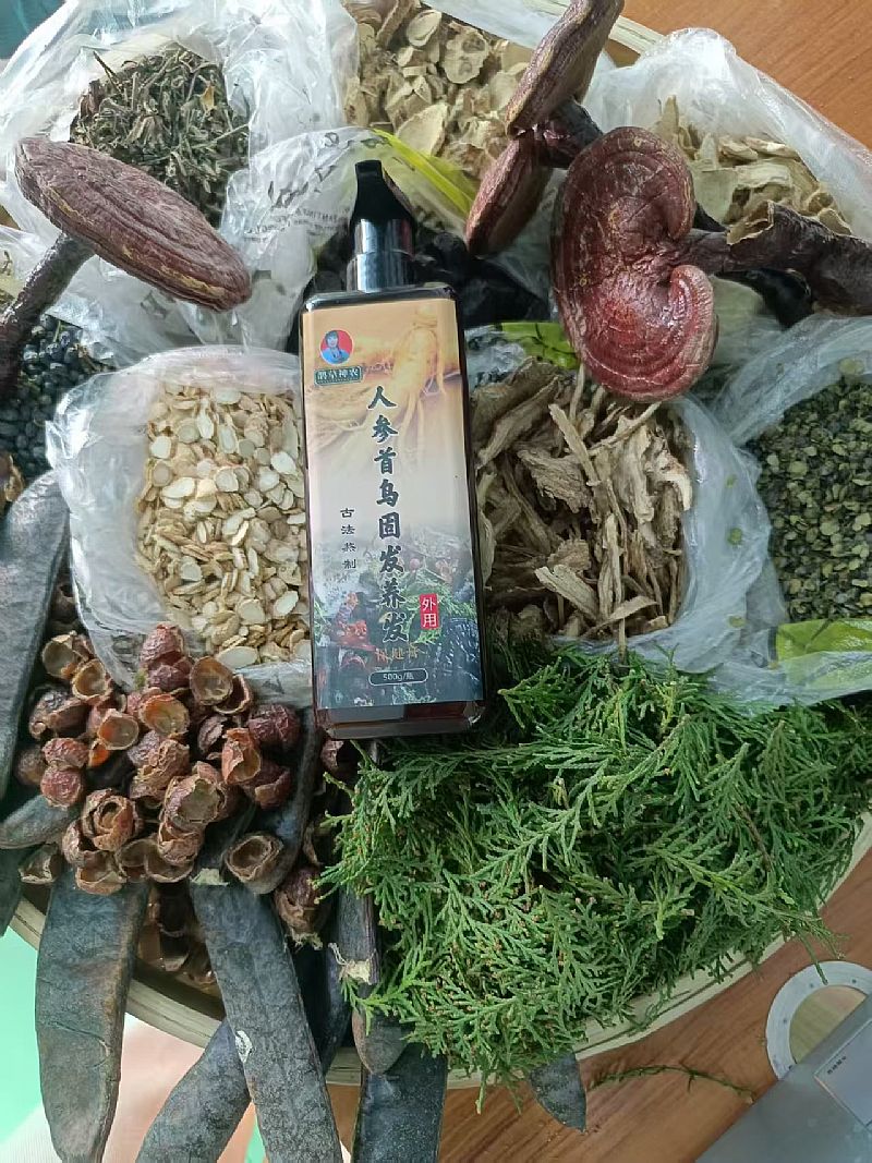 | 主要成分 | 人參、何首烏。黑靈芝、黃側(cè)柏葉、無(wú)患子、皂角、山茶籽、墨旱蓮、當(dāng)歸、苦參、桑葚、女貞子、甘草、水, |