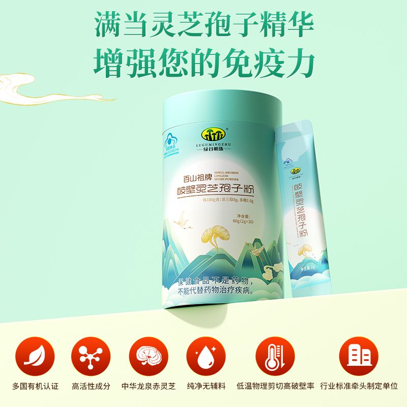 | 產(chǎn)品名稱 | 綠谷明珠牌破壁靈芝孢子粉2g*30包 |