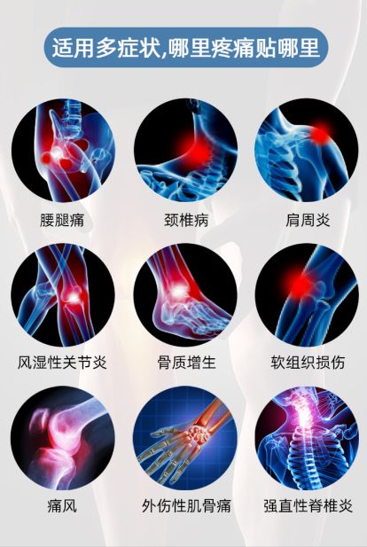| 產(chǎn)品用途 | 促進局部血液循環(huán),輔助消炎,消腫和止痛。一型適用于肩周炎,關(guān)節(jié)炎,頸椎病,腰椎間盤突出,腰肌勞損,足跟痛,骨關(guān)節(jié)炎,膝骨關(guān)節(jié)炎,骨質(zhì)增生,腱鞘炎,跌打損傷,扭挫傷引起的疼痛的輔助治療。 |