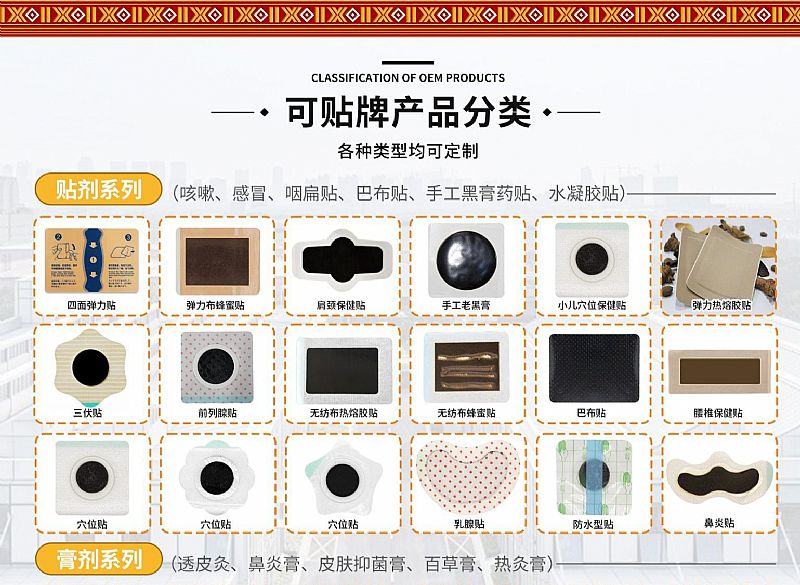 | 產(chǎn)品賣點 | 山東九興藥業(yè)膏藥加工廠家,一二類械、健字號、企業(yè)標準,資質(zhì)齊全。專注各類膏藥、穴位貼、小兒貼、三伏貼、理療貼、熱療貼、暖宮貼、疼痛類凝膠等貼牌加工服務(wù),臨床中標掛網(wǎng)可醫(yī)保報銷。支持定制**尺寸、材質(zhì),資質(zhì)齊全,免費打樣,一站式服務(wù),幫您打造屬于自己的膏藥品牌!膏藥貼牌加工:15966617905 |