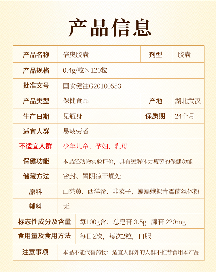 | 補充說明 | [適宜人群]易疲勞者 [不適宜人群]少年兒童、孕婦、乳母 [貯藏方法]密封、置陰涼干燥處 [保質(zhì)期]24個月 [注意事項]本品不能代替藥物;適宜人群外的人群不推薦食用本產(chǎn)品 |