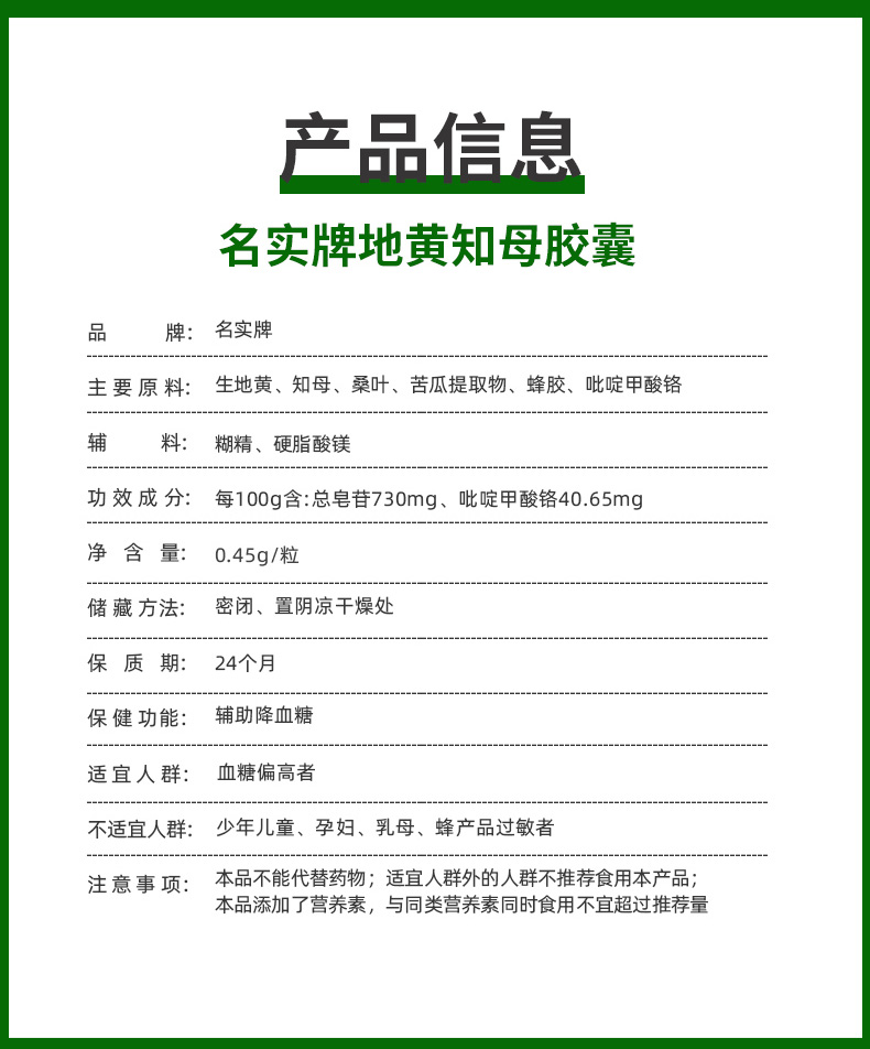 | 主要成分 | 生地黃、知母、桑葉、苦瓜提取物、蜂膠、吡啶甲酸鉻 |