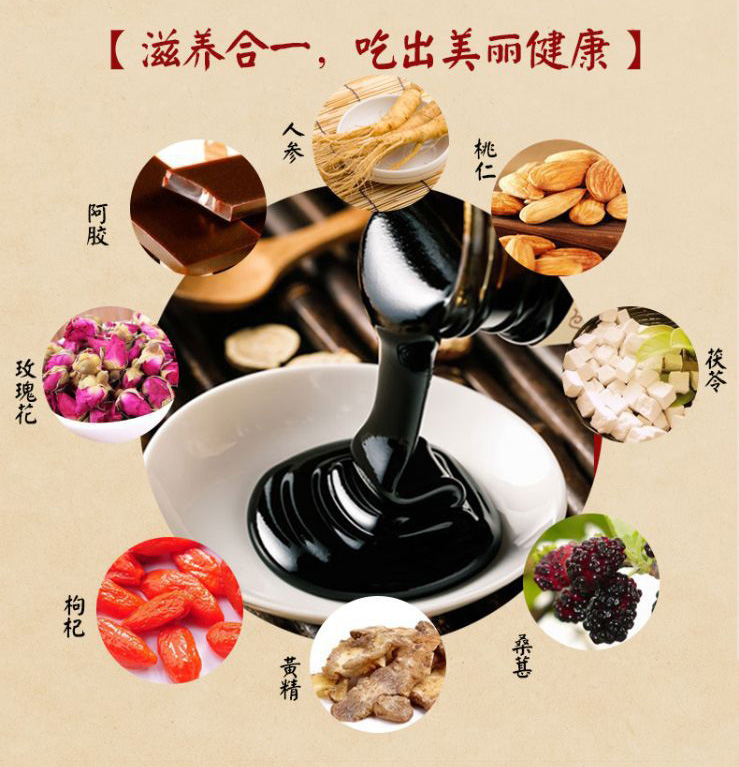 | 主要成分 | 麥芽糖、白砂糖、蜂蜜、茯苓、桑椹、黃精、枸杞、梔子、桃仁、玫瑰花(重瓣紅玫瑰)、酸棗仁、人參(五年及五年以下人工種植)、阿膠、檸檬酸、乙二胺四乙酸鐵鈉 |