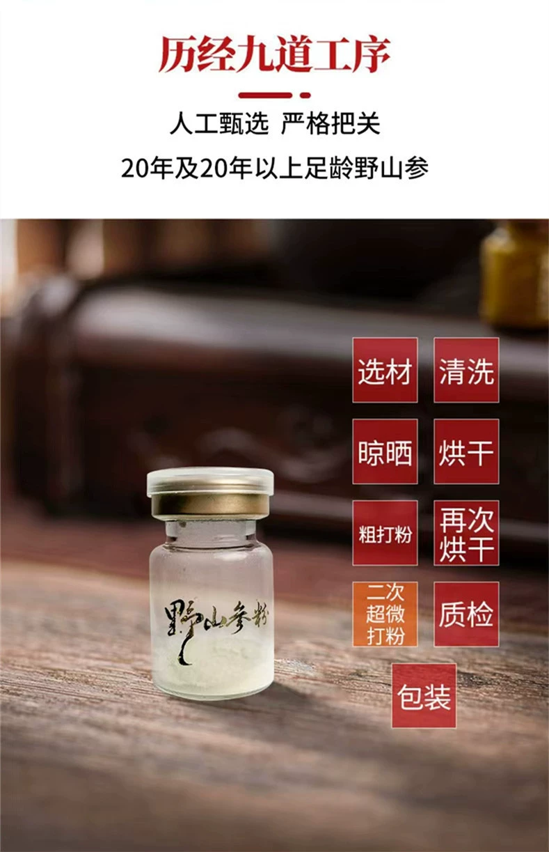 | 補(bǔ)充說明 | 核心賣點(diǎn) 1、產(chǎn)地:精選長白山核心產(chǎn)區(qū),該地區(qū)生態(tài)環(huán)境原始、土壤肥沃、氣候適宜,是野山參的黃金生長地帶。 2、甄選標(biāo)準(zhǔn):只選用生長15年以上、形態(tài)飽滿、品相上乘的純貨野山參作為原料,人參皂苷含量超過4.4%。 3、國家地理標(biāo)志:通過長白山人參地理標(biāo)識認(rèn)證。 4、口感適口性:口感醇厚,參味馥郁,味道略苦,回甘明顯,舌底生津。 5、野山參粉:絕不添加任何輔料、防腐劑、色素或香精,**產(chǎn)品的天然與純粹。 |