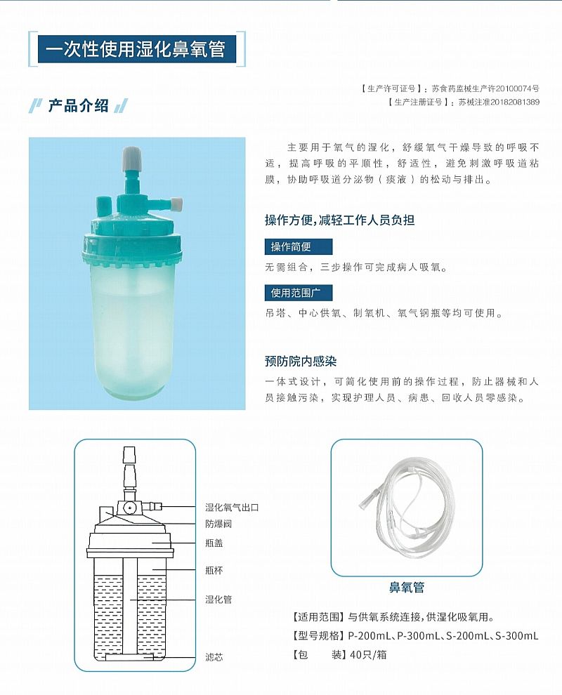 | 補(bǔ)充說明 | 【結(jié)構(gòu)及組成】 一次性使用濕化鼻氧管由吸氧濕化裝置和鼻氧管兩部分組成,吸氧濕化裝置由氧氣接口、濕化氧氣出口、霧化氧氣接口(s型適用)、護(hù)帽、**閥、濕化瓶杯、濕化瓶蓋、氧氣濕化管、發(fā)泡器、三通閥(s型適用)、濕化液(可沒有)組成;鼻氧管由氣源接頭、輸氧管路(粗、細(xì))、三通接頭及鼻塞組成。吸氧濕化裝置的護(hù)帽、鼻氧管采用軟聚氯乙烯塑料制成,其余部件采用聚丙烯塑料制成,濕化液應(yīng)符合2015版《中國藥典》中純化水的要求。按結(jié)構(gòu)不同分為普通型(p型)和三通型(s型),同時(shí)根據(jù)濕化液量的不同分為200ml、300ml。產(chǎn)品經(jīng)鈷-60輻射滅菌,無菌。 【適用范圍】與供氧系統(tǒng)連接,供濕化吸氧用。 【使用方法】 1、打開包裝,取出包裝內(nèi)物件; 2、將鼻氧管氣源接頭與濕化瓶上的氧氣出口連接; 3、將濕化裝置氧氣接口連接供氧系統(tǒng); 4、調(diào)節(jié)好氧氣流量(1l/min-5l/min),戴好鼻氧管即可進(jìn)行吸氧; 5、如需霧化,將三通閥手柄旋轉(zhuǎn)至與氧氣接口呈平行狀態(tài)即可。 |