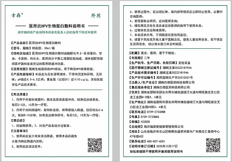 | 主要成分 | 醫(yī)用抗HPV生物蛋白敷料由酸酐化牛β-乳球蛋白、甘油、卡波姆、純化水、醫(yī)用高分子聚乙烯塑膠瓶組成,液體型配有取得醫(yī)療器械備案憑證的醫(yī)用陰道沖洗器。 |