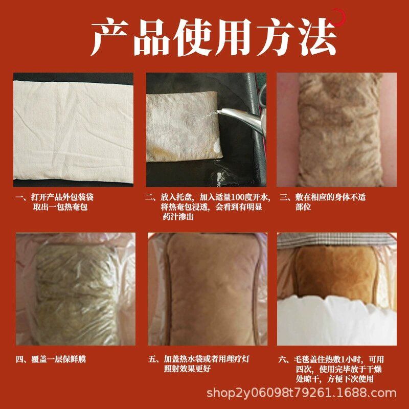 | 使用方法 | 加熱方式 微波爐加熱:在藥包表面噴少許清水,中火加熱2–3分鐘,取出搖勻,測試溫度后使用。 蒸鍋加熱:隔水蒸10–15分鐘,蒸透后取出,放至適宜溫度再敷。 使用方式 熱敷于頸肩、腰腹、關(guān)節(jié)等不適部位,皮膚敏感者可隔一層薄布使用。 每次熱敷15–30分鐘,以溫?zé)崾孢m、不燙傷皮膚為宜。 |